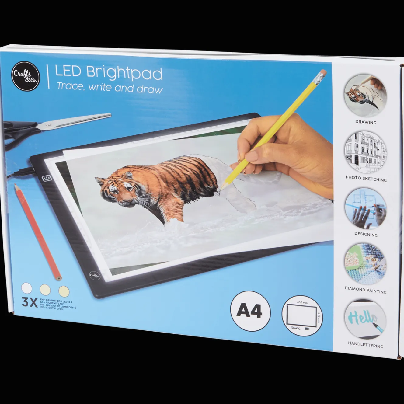 Dit tekenbord met licht is ideaal als lightpad onder tekeningen, diamond paintings of handlettering. Geschikt om te traceren, schrijven en tekenen.