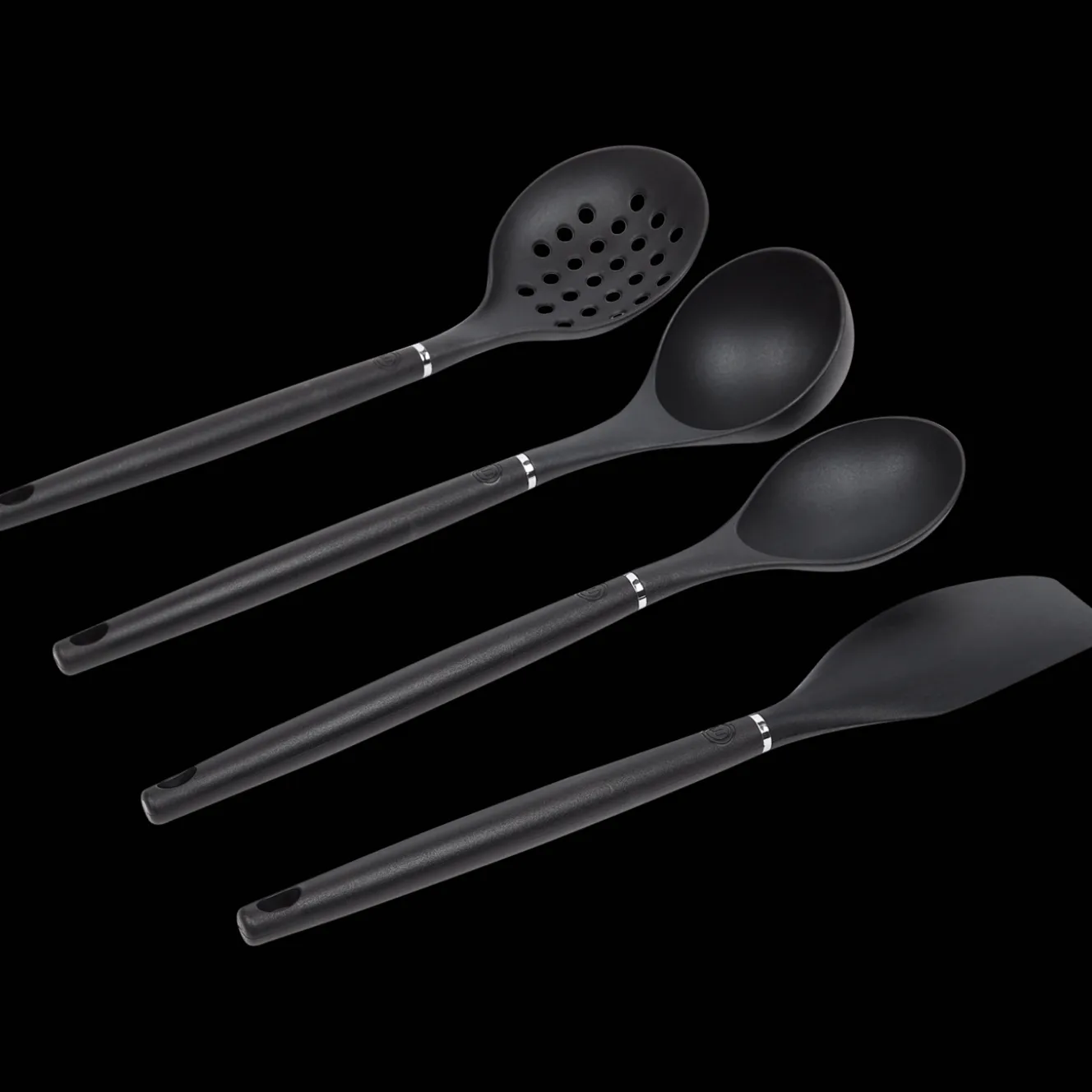 Bevat essentiƫle keukentools zoals een soeplepel, schuimspaan, opscheplepel en grote spatel.