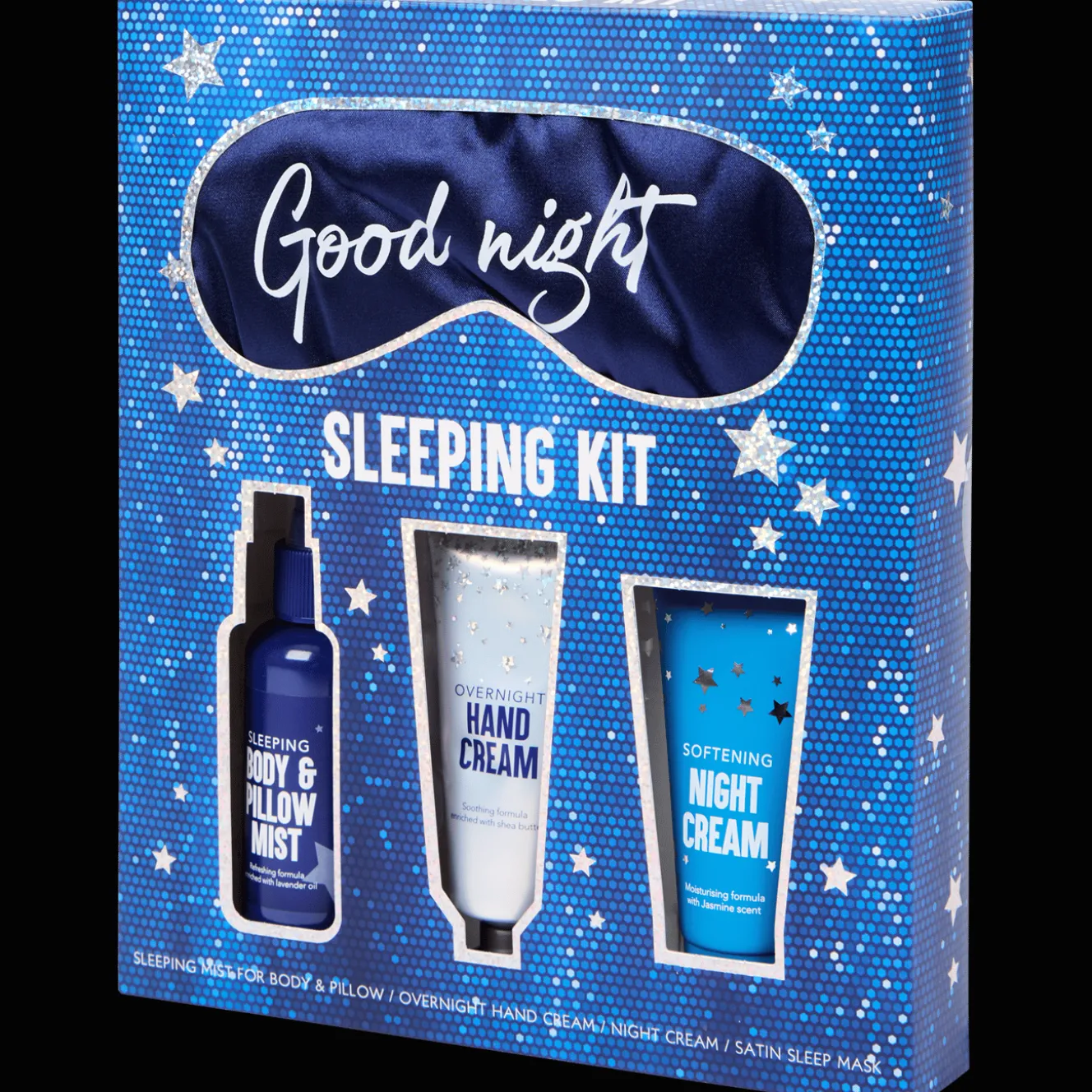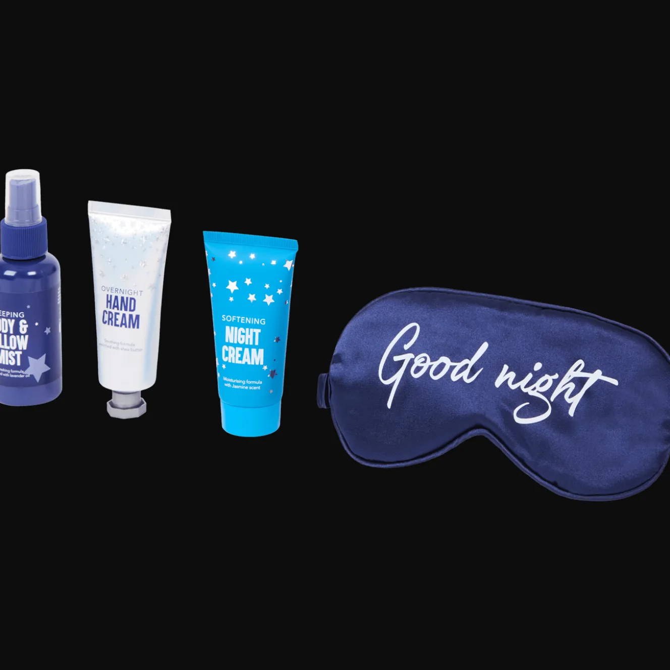 Alles wat je nodig hebt voor een ontspannen nacht, inclusief body & pillow mist, handcrème, nachtcrème en een zijdezacht slaapmasker.