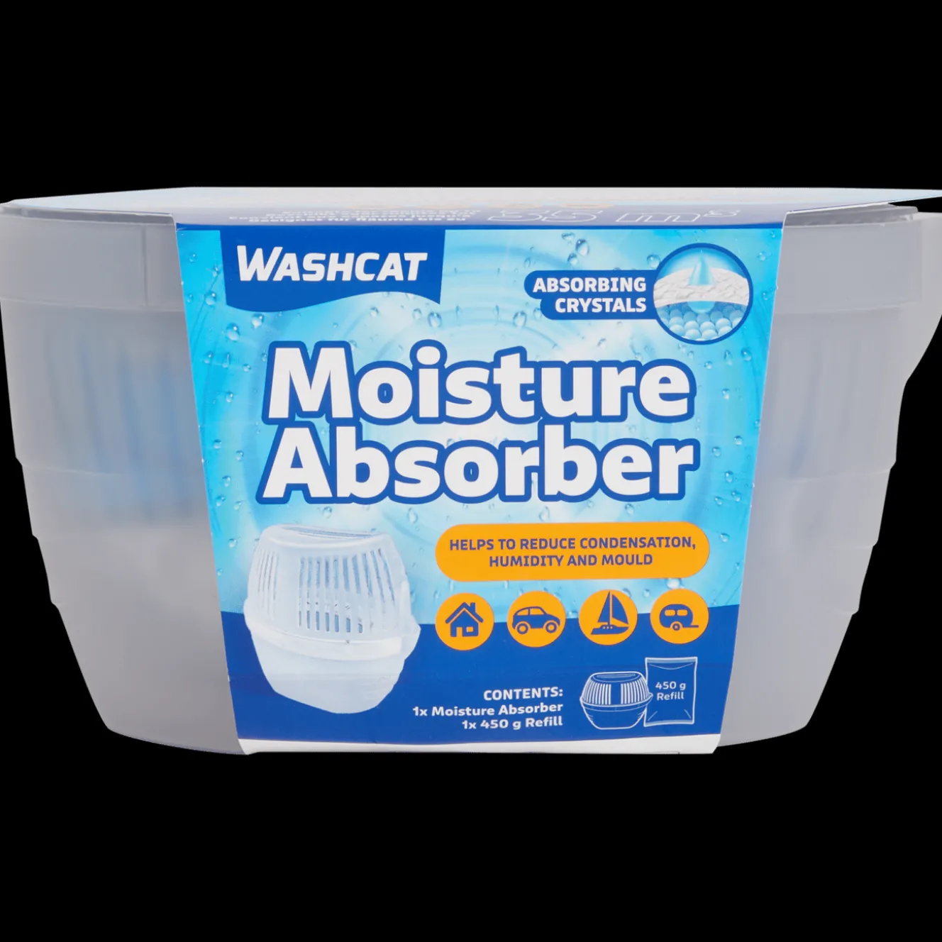 De Washcat vochtvanger is gevuld met absorberende korrels die het vocht opnemen. Zo voorkom je beslagen ramen of condens in huis of in je auto.