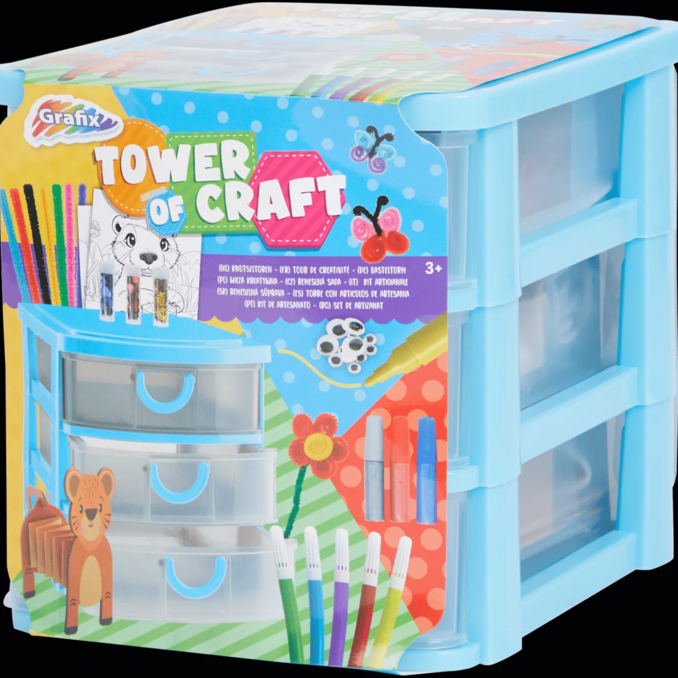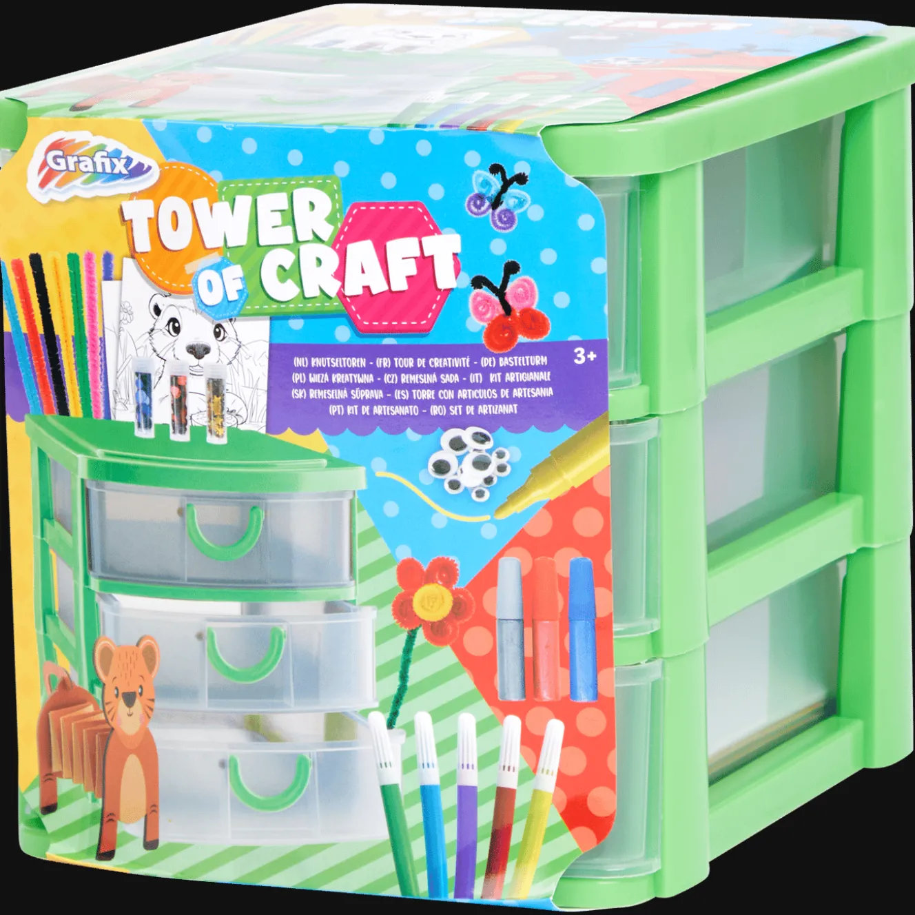 Deze te gekke knutseltoren zit bomvol knutselspulletjes voor urenlang knutselplezier. Versier kaarten met glitters, ga lekker kleuren of wees creatief met draad. De mogelijkheden zijn eindeloos!